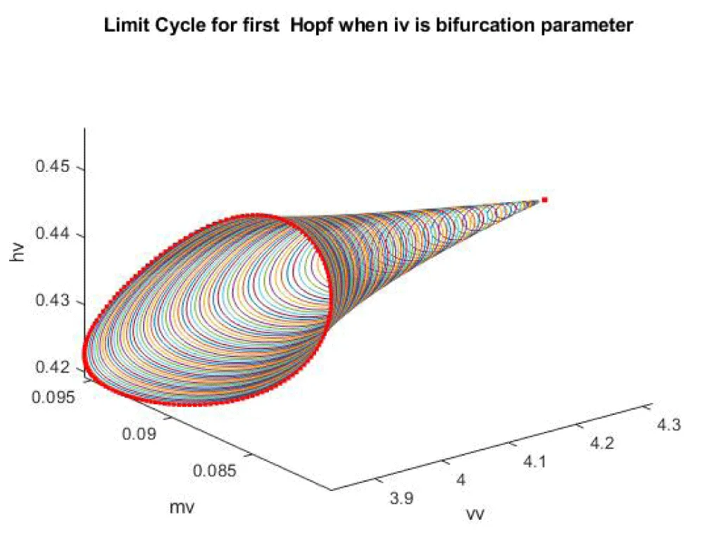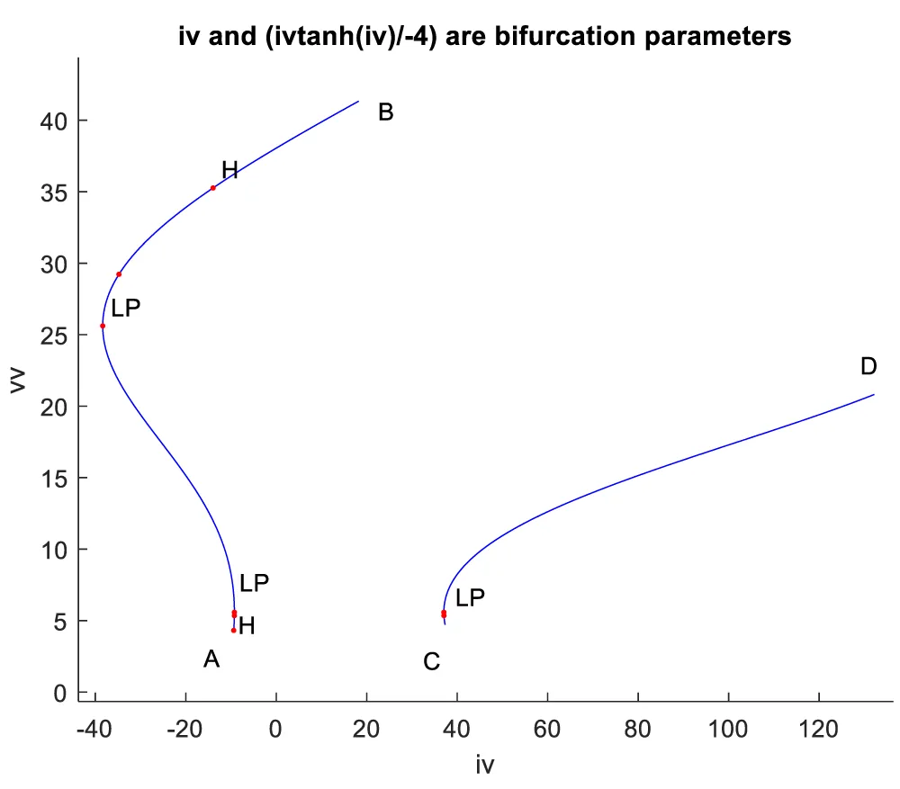 When iv is the bifurcation parameter, 2 Hopf bifurcation points and 2 limit points were found at ( vv, mv, hv, nv, iv ) values of (4.315738, 0.086823, 0.442071, 0.385365, -9.406583); (35.263043, 0.739314, 0.01874, 0.773422, -13.971904); (5.583270, 0.099806, 0.398118, 0.405571, -9.261244 ); and (25.615543, 0.516846, 0.047253, 0.685295, -38.368717). This is shown in curve AB in Figure 1a. When iv is changed to (iv ((tanh (iv)/-4) the Hopf bifurcations disappear, and a limit point occurs at (5.583312 0.099807 0.398116 0.405572 37.044974). This is seen in curve CD in Figure 1a. The limit cycles for these two Hopf bifurcation points are shown in Figure 1b and Figure 1c.