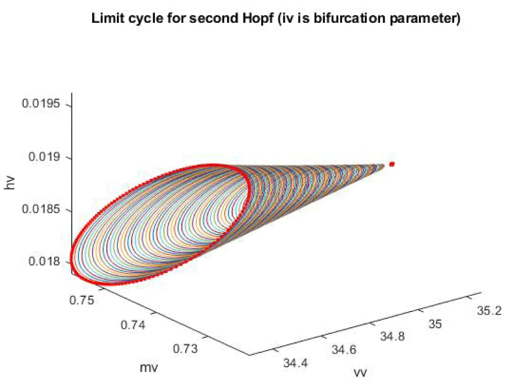 Typically, the Hopf bifurcation is the most common mechanism for the emergence of limit cycles in the HH model. Above a certain critical level of the injected current, the pair of complex-conjugate eigenvalues of the linearization of the system crosses the imaginary axis, causing instability of the steady-state solution and leading to the birth of a small limit cycle that can further develop into a large limit cycle representing spiking activity. Depending on the choice of parameter values, the Hopf bifurcation can be either subcritical or supercritical.