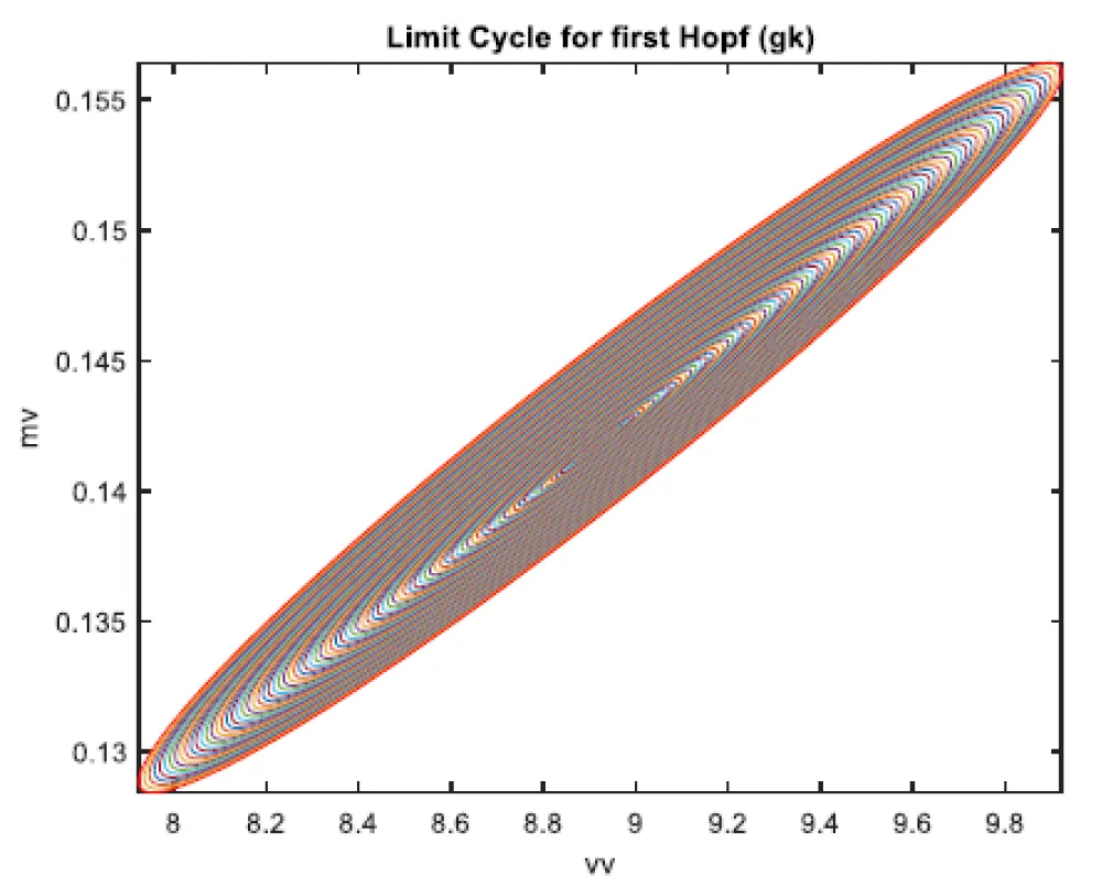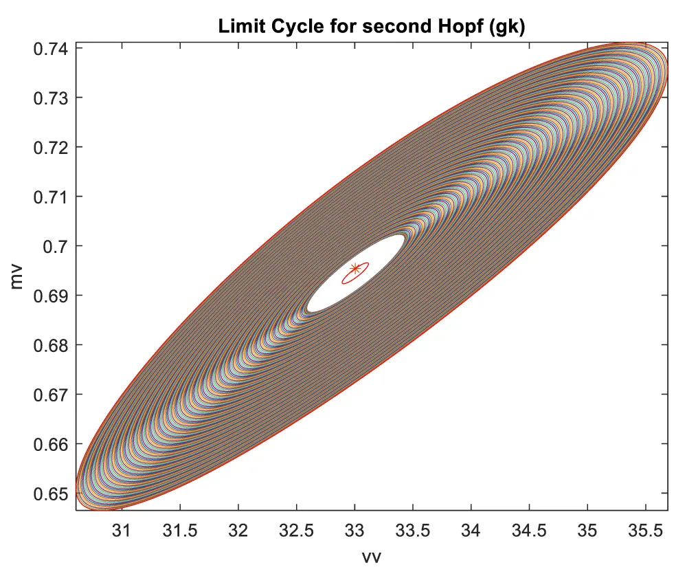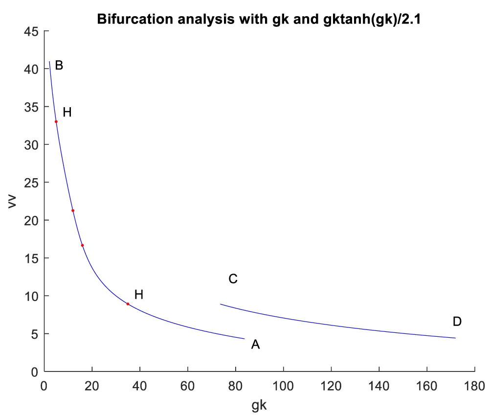 When gk is the bifurcation parameter, 2 Hopf bifurcation points were found at ( vv, mv, hv, nv, gk ) values of (8.916507, 0.141771, 0.292738, 0.458508, 34.941511); (33.004623, 0.694442, 0.022858, 0.755492, 4.973283). This is shown in curve AB in Figure 2a. When IV is changed to (gk ((tanh (IV)/2.1) the Hopf bifurcations disappear. This is seen in curve CD in Figure 2a. The limit cycles for these two Hopf bifurcation points are shown in Figure 2b and Figure 2c.