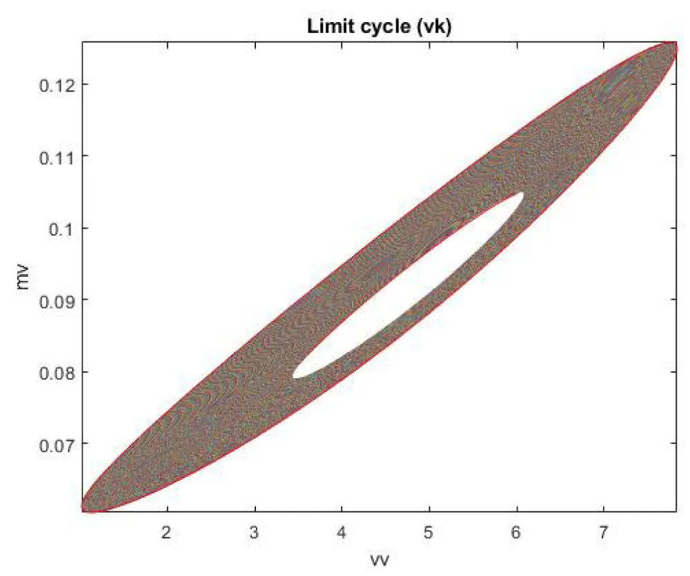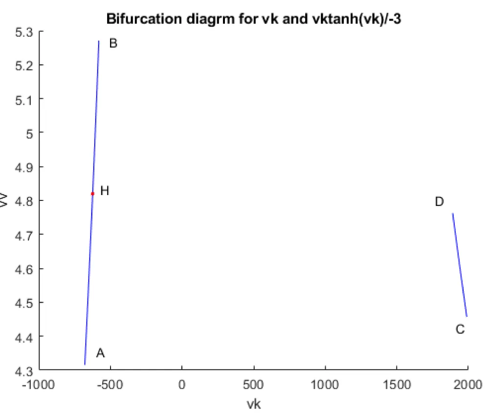 When vk is the bifurcation parameter, a Hopf bifurcation points were found at ( vv, mv, hv, nv, vk ) values of (4.819640, 0.091802, 0.424415, 0.393393, and 624.006805). This is shown in curve AB in Figure 3a. When IV is changed to (vk ((tanh (vk)/-3), the Hopf bifurcation disappears. This is seen in curve CD in Figure 3a. The limit cycle for this Hopf bifurcation point is shown in Figure 3b.