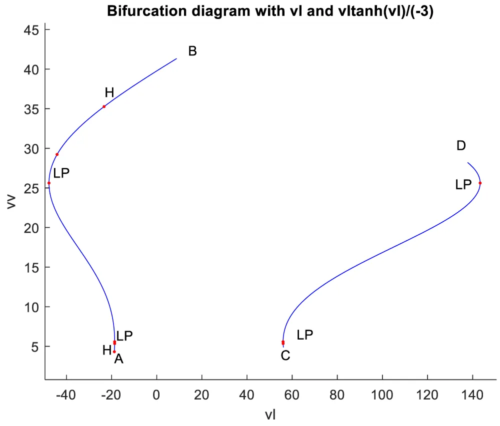 When vl is the bifurcation parameter, 2 Hopf bifurcation points and 2 limit points were found at ( vv, mv, hv, nv, vl ) values of (4.315738, 0.086823, 0.442071, 0.385365, -18.807583); (35.263043, 0.739314, 0.01874, 0.773422, -23.372904); (5.58327, 0.099806, 0.398118, 0.405571, -18.662244); (25.615543, 0.516846, 0.047253, 0.685295, -47.769717). This is shown in curve AB in Figure 4a. When vl is changed to (vl((tanh(vl)/-3) the Hopf bifurcation disappears, but two limit points occur at (5.583312, 0.099807, 0.398116, 0.405572, 55.986731);(25.615553, 0.516847, 0.047253, 0.685295, 143.309151). This is seen in curve CD in Figure 4a. The limit cycles for the two Hopf bifurcation points are shown in Figures 4b and 4c.