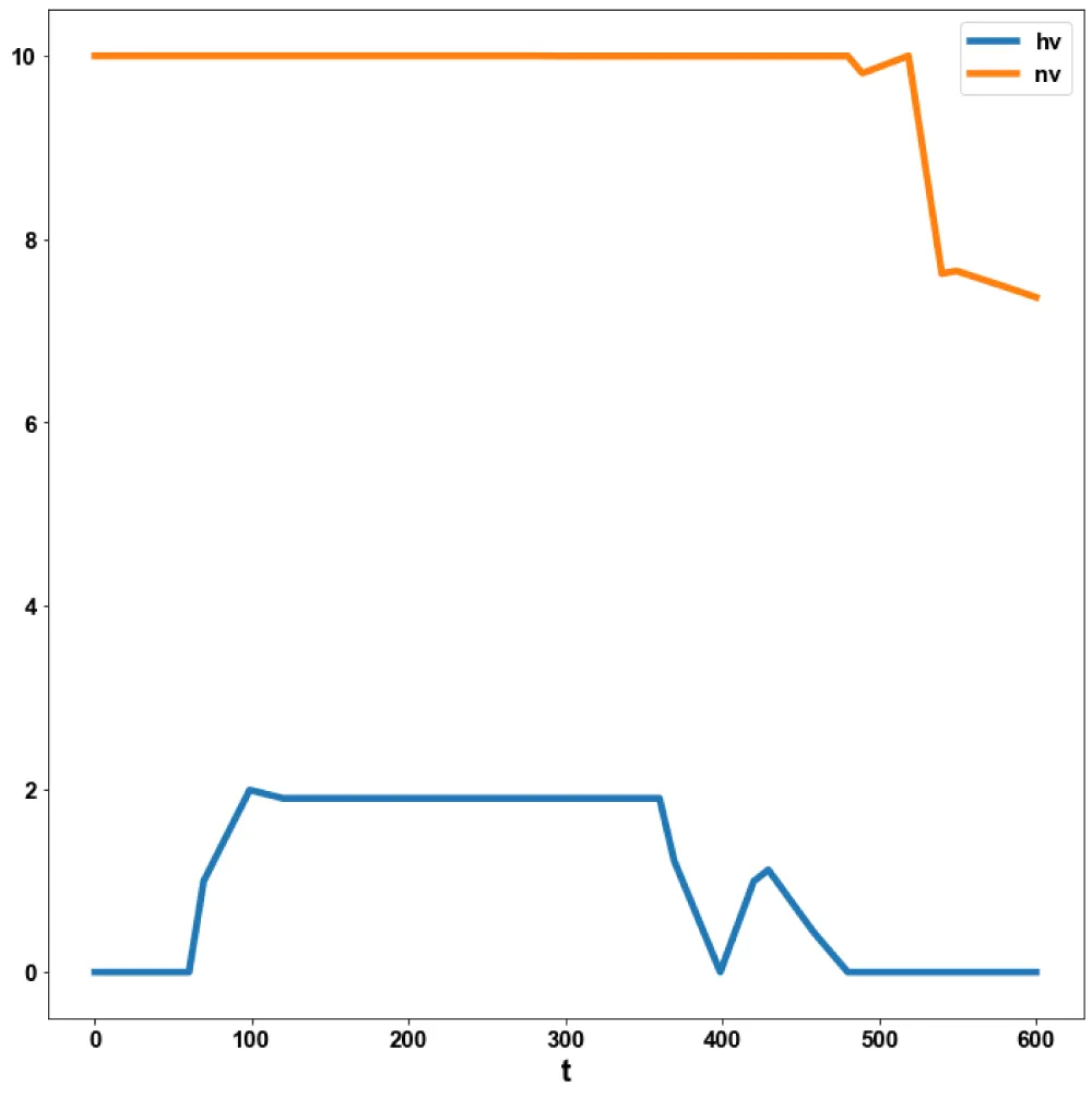 Figure 5d: MNLMPC hv, nv vs t.